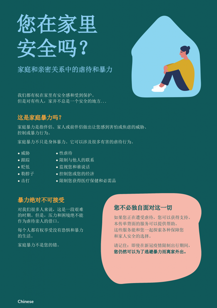 This flyer includes information for people experiencing family violence translated into Chinese (Simplified).