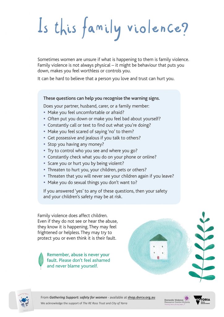 This A3 poster includes a list of questions to help women determine if they may be experiencing family violence.